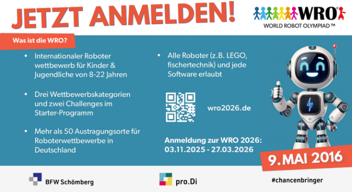 Am 09. Mai 2026 wird das BFW Schömberg zum Austragungsort eines spannenden Vorentscheids der World Robot Olympiad – einem internationalen Roboterwettbewerb für Kinder und Jugendliche!